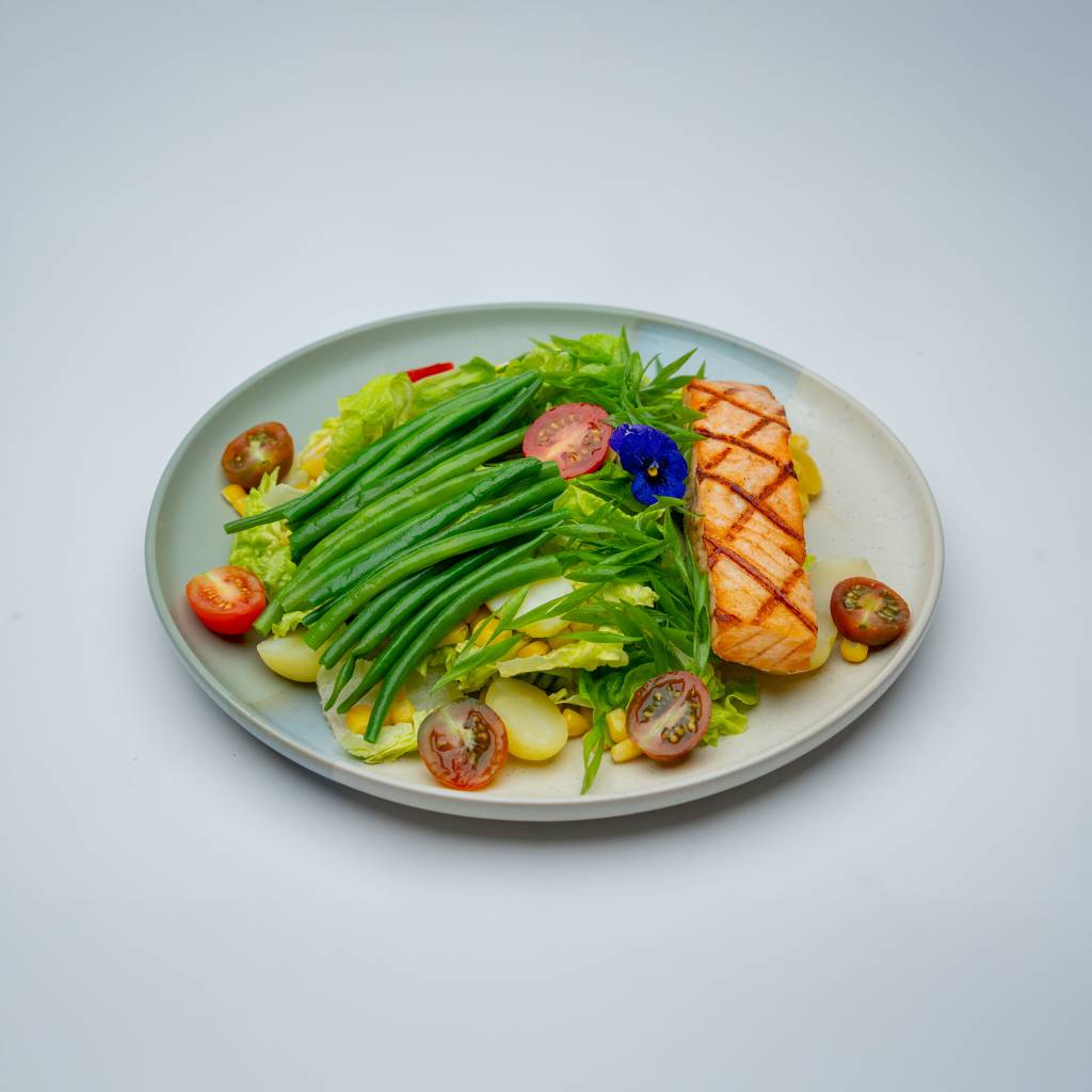 Salmon, Baby Gem Lettuce, Baby Potato, Sweet Corn, Green Beans, Cherry Tomato, Spring Onion