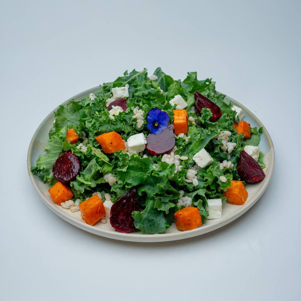 Kale, Farro, Beetroot, Feta Cheese, Vinegar, Olive Oil, Cajun Spice, Salt, Pepper