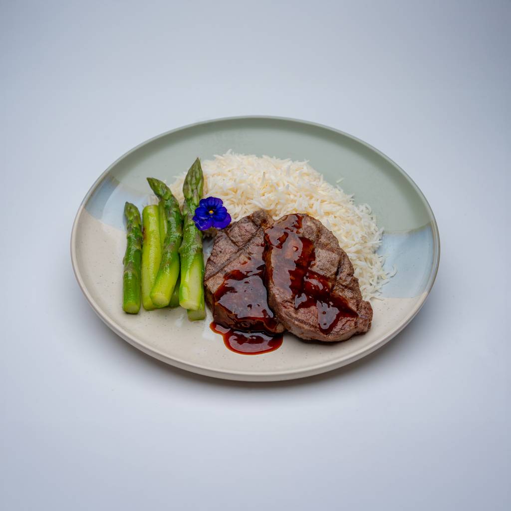 White rice, Grilled beef, Asparagus
