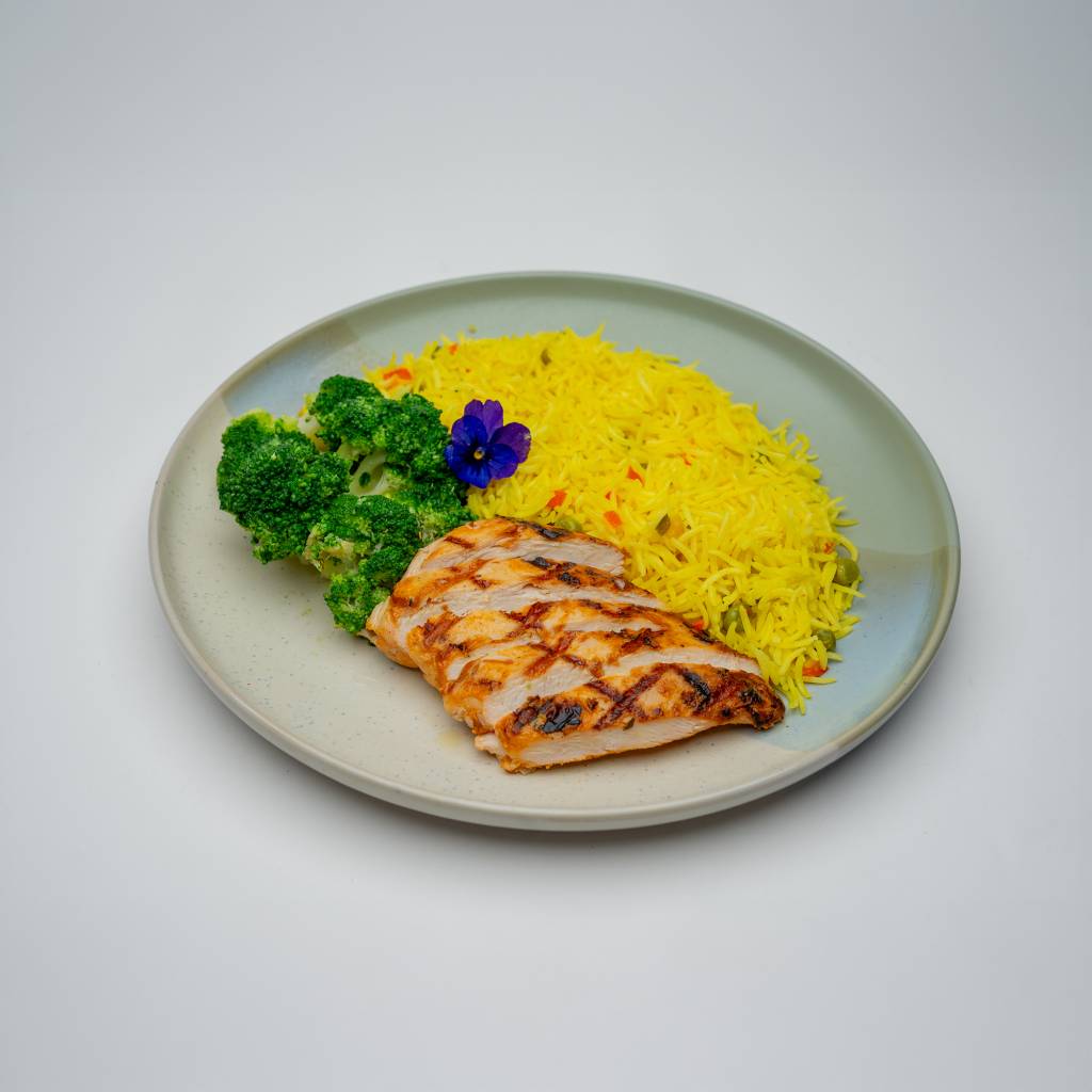 Yellow rice, Chicken breast, Broccoli
