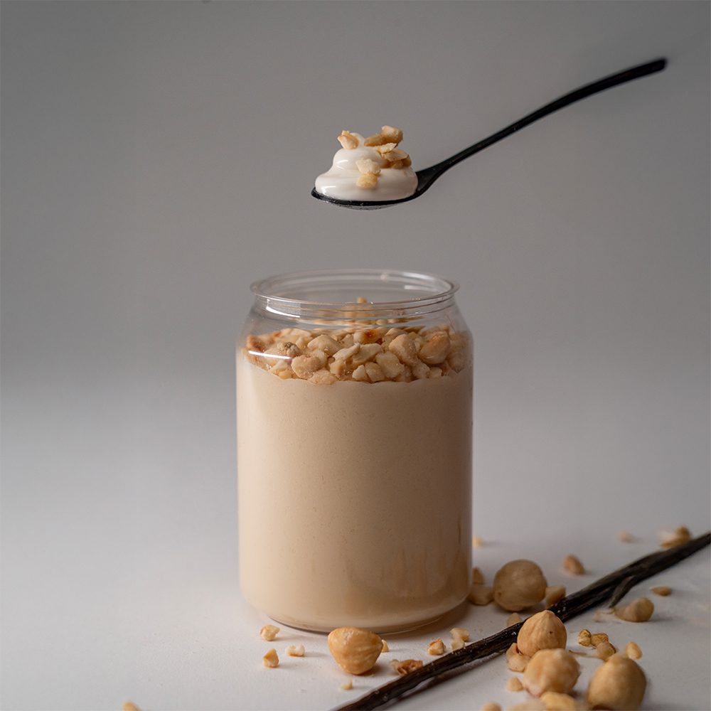 Almond Milk, Whey Vanilla Protein Powder, Gelatin, Vanilla Bean, Hazelnut Chopped